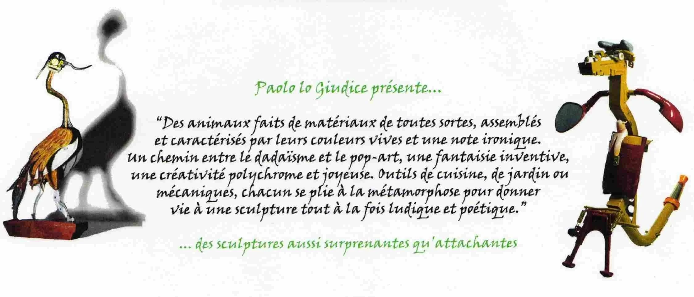 “ Nei giocosi, ironici, ingegnosi assemblaggi di Paolo Lo Giudice l’inerte, l’inanimato prende forme e sembianze di essere animato, diviene “animale” fantastico o cartone “animato” reinterpretato. Il pezzo di macchina o l’utensile rotto o il macchinario in disarmo, viene smontato e rimontato con la precisione di un ingegnere folle che ha deciso di sostituire il principio dell’utilità e della funzionalità con quello forse più utile e funzionale del divertimento e della fantasia. E un pezzo di motorino che non funziona più o un frullatore rotto può servire a rimettere in moto la nostra intelligenza e aggiustare la nostra allegria. Con un sovrappiù di riflessioine sulle forme “biomorfe” che si celano negli ingranaggi delle forme meccanomorfe. E forse anche di velata nostalgia. L’artista rievoca attraverso una marmitta rovesciata il corpo e il collo di aironi e altri sontuosi volatili, che proprio tante marmitte scoppiettanti (e funzionanti) stanno portando al rischio di estinzione. E il canto del cigno di metallo nasconde dietro la risata beffarda forse una nota sorda e vibrante di sarcasmo che sfuma nell’amarezza e nella malinconia. E non è un caso allora che Lo Giudice abbia, tra i tanti personaggi, un giorno rievocato con pezzi di ferro e bulloni la maschera tragicomica di Charlot. Anche Paolo Lo Giudice, come Charlot, ci fa sorridere sui “Tempi moderni”, con un fondo di struggente nostalgia. Anzi, no, per essere precisi Paolo Lo Giudice, a differenza di Charlie Chaplin, ci fa sorridere sui nostri “Tempi Post Moderni”, ovvero post-industriali, post-umani, postulanti, posticci, postribolari... E come un Mago di Oz dalla discarica del nostro consumismo meccanizzato egli fa sorgere eserciti di ferri-vecchi in rivolta armata… no, non armati di rivoltelle, ma di risate. E, si sa, sarà una risata che ci seppellirà… speriamo almeno di essere morti, per allora. “